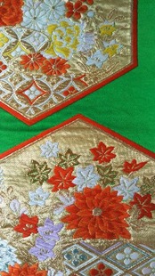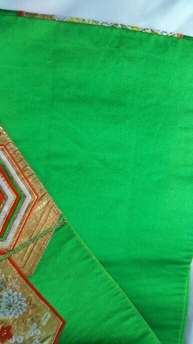繻子織り 鮮やかな緑地 亀甲に花とおめでたい柄です。